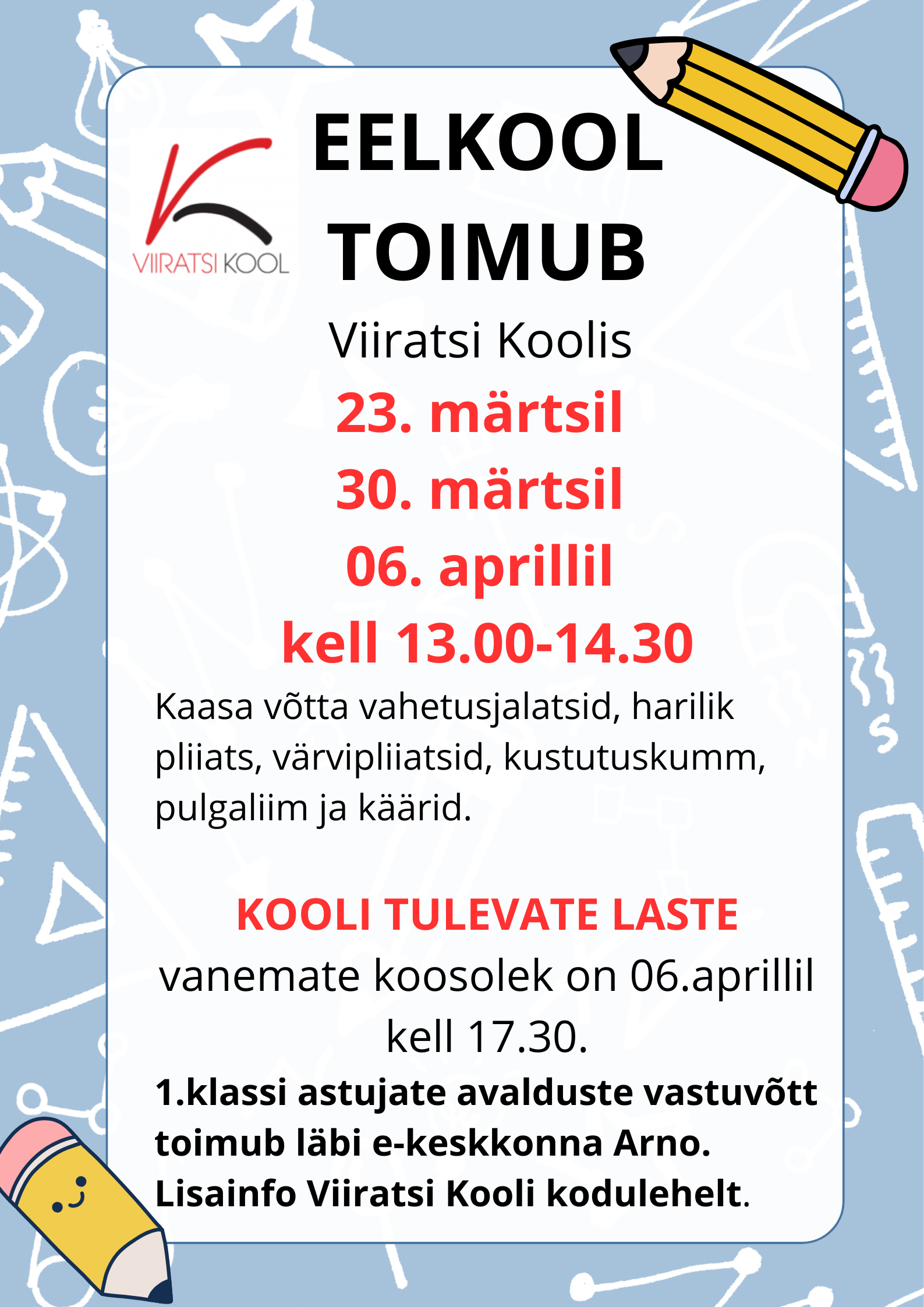 Kooli tulevate laste vanemate koosolek on 6. aprillil kell 17:30